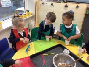 We talked about the cold, wet weather. The children then began to think about the birds in our garden and wondered what they were eating? We decided to make them some food. Cutting up lard very carefully, we mixed it together with bird seed, it was “sticky” and “gooey”