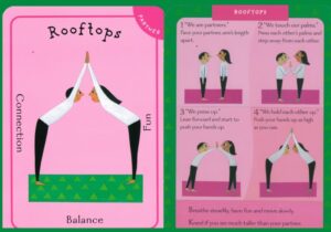 We start with some breathing exercises, move on to individual poses and then partner work. We finish with some meditation or breathing exercises again.