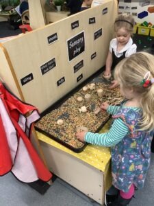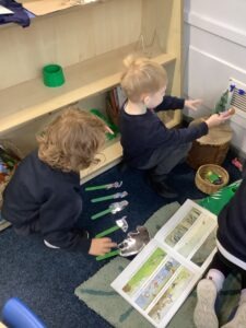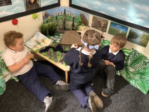 In our story corner, children have enjoyed listening to the story of ‘We’re going on a bear hunt’. They’re getting really good at re-telling the story and joining in with the repeated refrains.