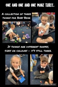 This week we have learnt that numbers can be composed of ones. We joined in with the STEM sentence “one and one and one make three” and made collections of three things for Baby Bear.
