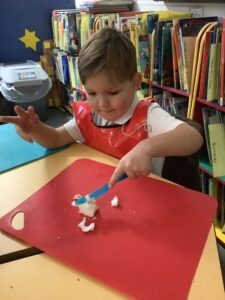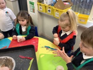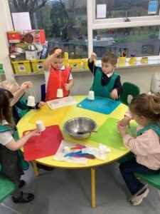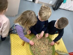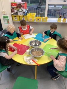 We talked about the cold, wet weather. The children then began to think about the birds in our garden and wondered what they were eating? We decided to make them some food. Cutting up lard very carefully, we mixed it together with bird seed, it was “sticky” and “gooey”