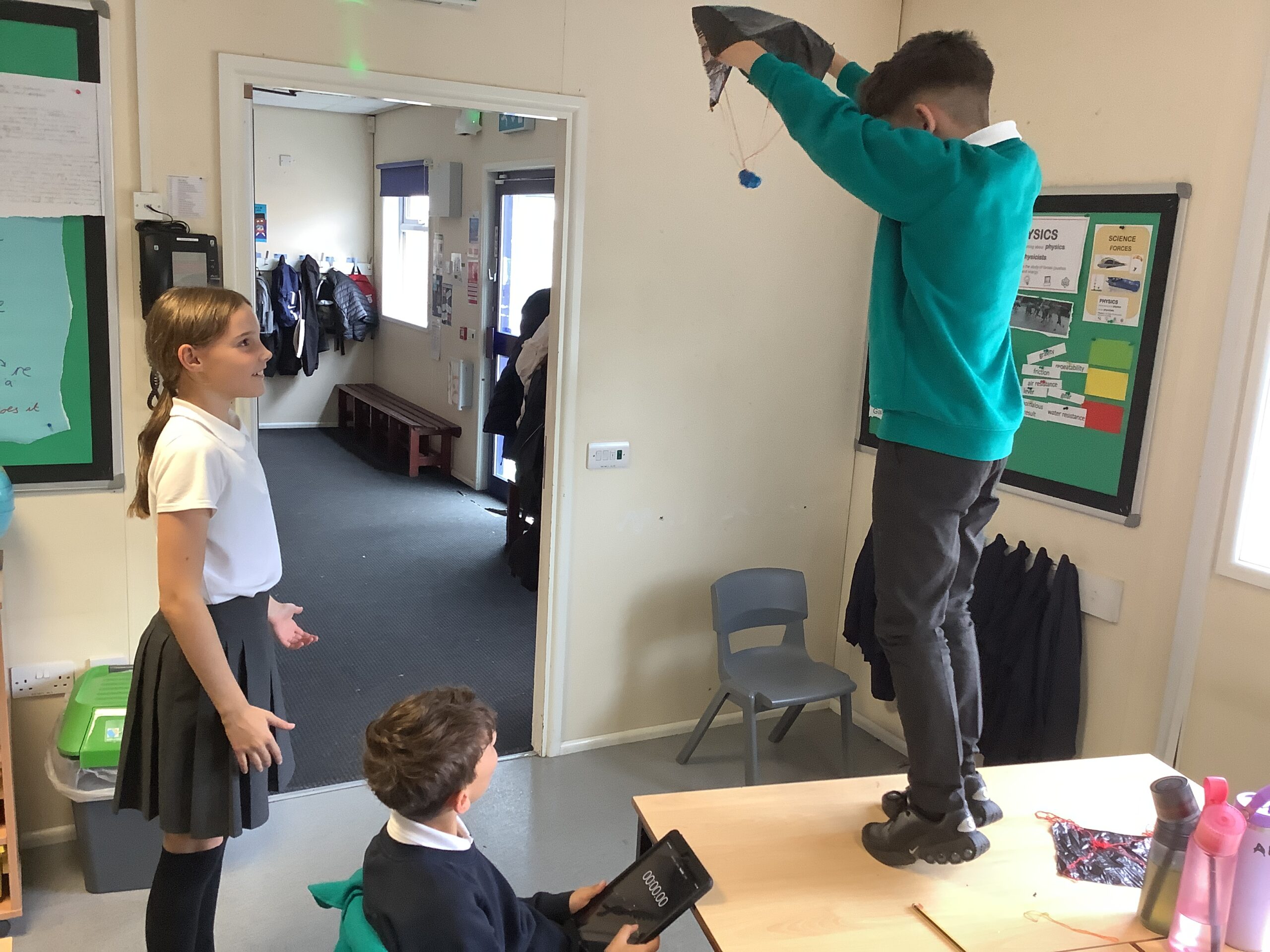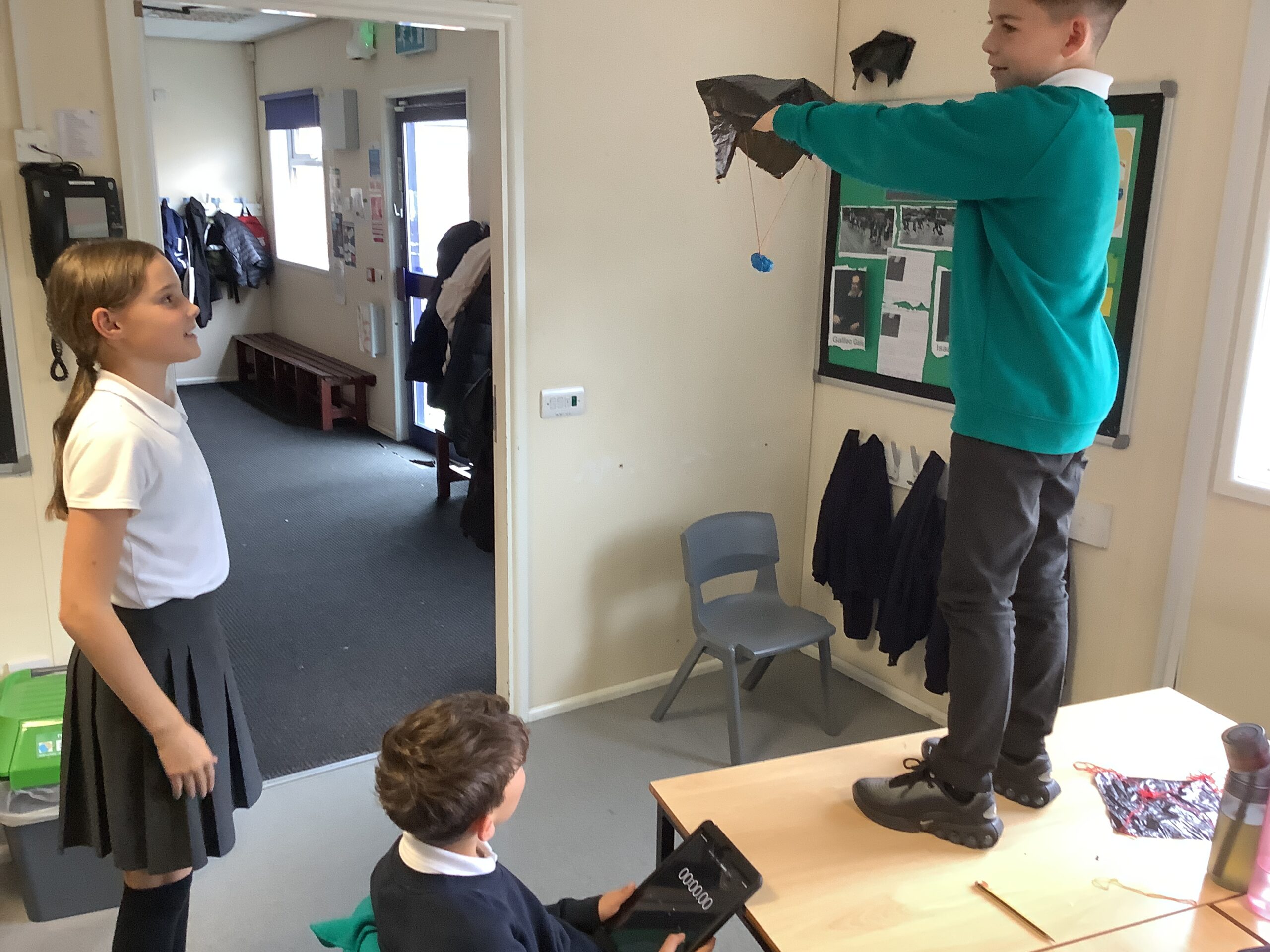 Year 5/6 have been conducting an experiment to identify the effect of air resistance. We made three parachutes with different surface areas. We then tested the parachutes 6 times each and took a mean average of the drop time.